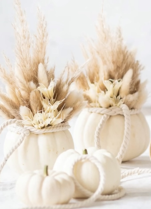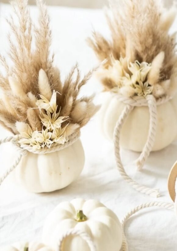 Wer kennt Sie nicht, die kleinen weisslichen Kürbisse – die Herbstboten. Du kannst den Kürbis mit Trockenblumen bestücken oder ihn in ein süßes Gesteck mit Hortensien, Erika und herbstlichen Elementen betten.